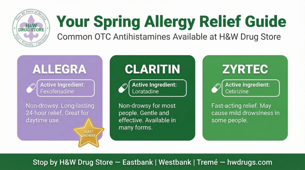 At H&W Drug Store, our pharmacists offer Medication Therapy Management (MTM), a personalized service that reviews all your medications and helps you build the most effective, safest plan for managing your health. It’s especially helpful during allergy season, when you might be adding new OTC products to your routine.